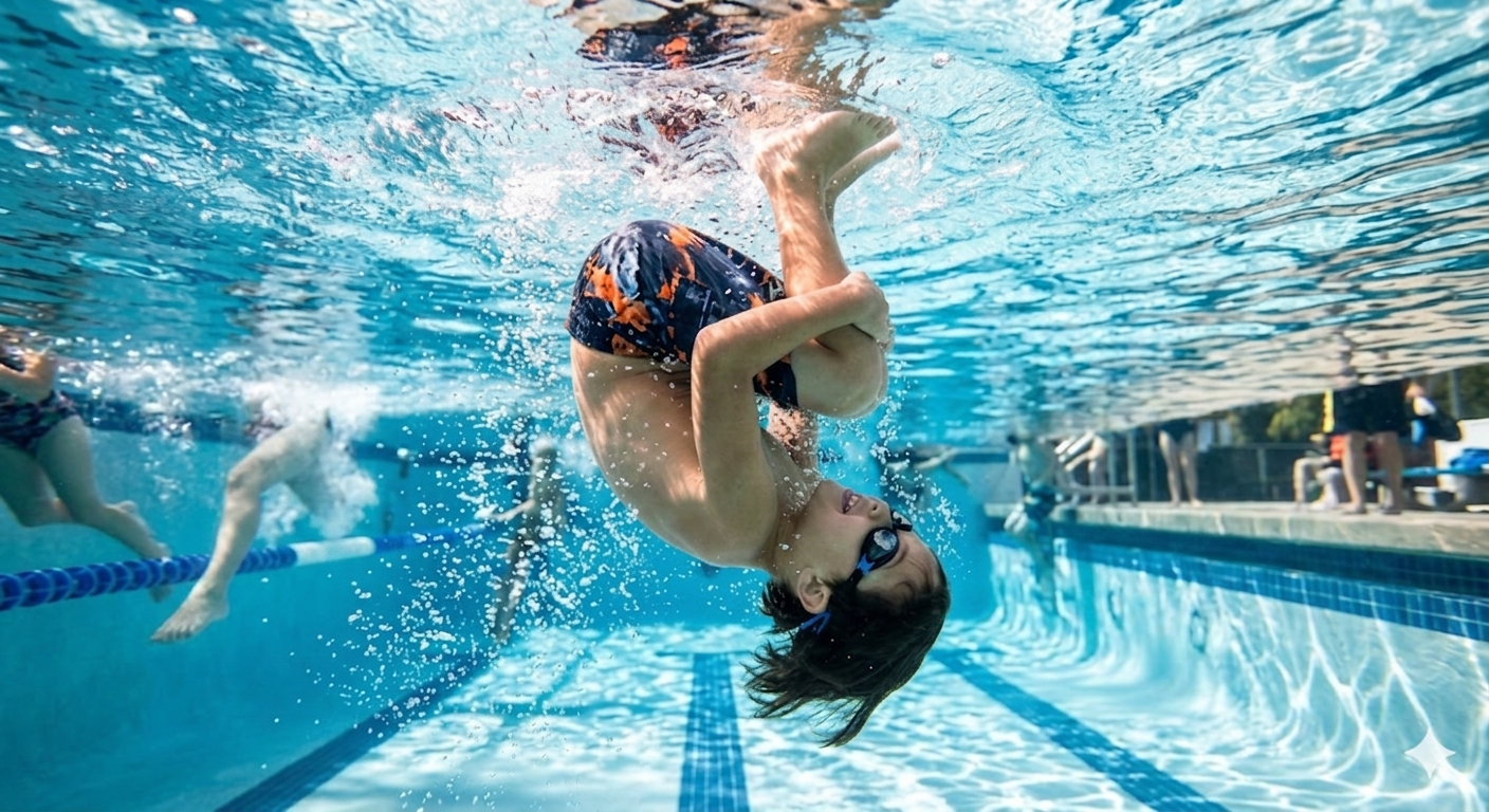 When I was about nine, I went to swimming lessons. I had been to the lake a bunch and I knew how to not drown but I didn’t really know how to swim. The teenage instructor told all us first day students to jump in the pool and show what we can do. Well.. say no more! I jumped in and did three or four underwater summersaults! Forward and backward! A handstand! They stopped me, laughing for some reason. “Yeah… we just want to see you try to swim to the other side.” Man. I didn’t even get a chance to show how I could blow bubbles out of my nose.